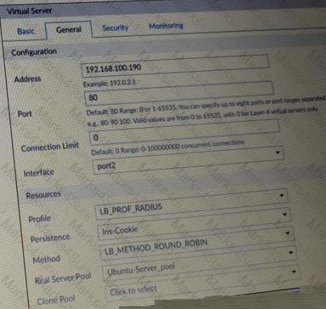 The exhibit shows the Basic andGeneral tabs of a virtual server configuration.