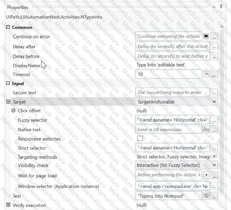 A developer is building an automation which types text into a text file. The Activity Project Settings for UI Automation Modern activities are set as follows: